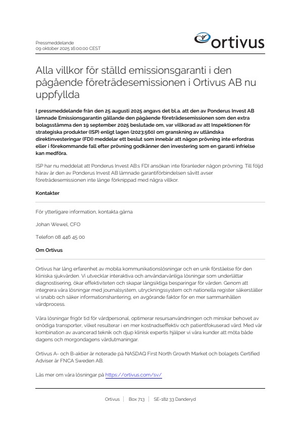 I pressmeddelande från den 25 augusti 2025 angavs det bl.a. att den av Ponderus Invest AB lämnade Emissionsgarantin gällande den pågående företrädesemissionen som den extra bolagsstämma den 19 september 2025 beslutade om, var villkorad av att Inspektionen för strategiska produkter (ISP) enligt lagen (2023:560) om granskning av utländska direktinvesteringar (FDI) meddelar ett beslut som innebär att någon prövning inte erfordras eller i förekommande fall efter prövning godkänner den investering som en garanti infrielse kan medföra.