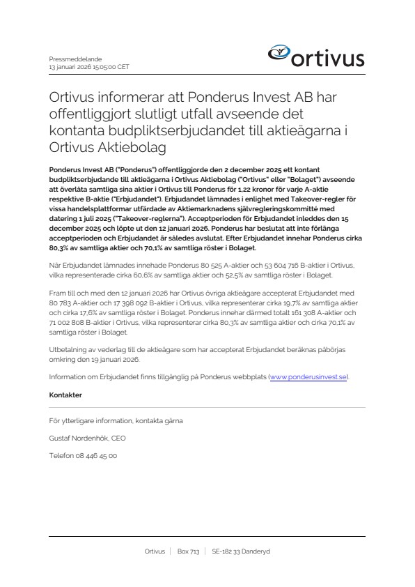 Ponderus Invest AB (”Ponderus”) offentliggjorde den 2 december 2025 ett kontant budpliktserbjudande till aktieägarna i Ortivus Aktiebolag (”Ortivus” eller ”Bolaget”) avseende att överlåta samtliga sina aktier i Ortivus till Ponderus för 1,22 kronor för varje A-aktie respektive B-aktie (“Erbjudandet”). Erbjudandet lämnades i enlighet med Takeover-regler för vissa handelsplattformar utfärdade av Aktiemarknadens självregleringskommitté med datering 1 juli 2025 (”Takeover-reglerna”). Acceptperioden för Erbjudandet inleddes den 15 december 2025 och löpte ut den 12 januari 2026. Ponderus har beslutat att inte förlänga acceptperioden och Erbjudandet är således avslutat. Efter Erbjudandet innehar Ponderus cirka 80,3% av samtliga aktier och 70,1% av samtliga röster i Bolaget.