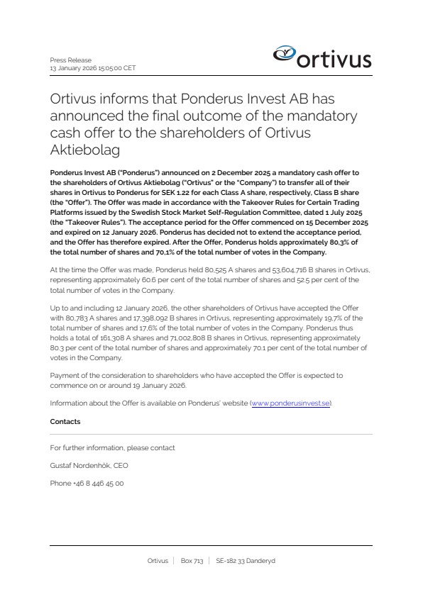 Ponderus Invest AB (“Ponderus”) announced on 2 December 2025 a mandatory cash offer to the shareholders of Ortivus Aktiebolag (“Ortivus” or the “Company”) to transfer all of their shares in Ortivus to Ponderus for SEK 1.22 for each Class A share, respectively, Class B share (the “Offer”). The Offer was made in accordance with the Takeover Rules for Certain Trading Platforms issued by the Swedish Stock Market Self-Regulation Committee, dated 1 July 2025 (the “Takeover Rules”). The acceptance period for the Offer commenced on 15 December 2025 and expired on 12 January 2026. Ponderus has decided not to extend the acceptance period, and the Offer has therefore expired. After the Offer, Ponderus holds approximately 80,3% of the total number of shares and 70,1% of the total number of votes in the Company.