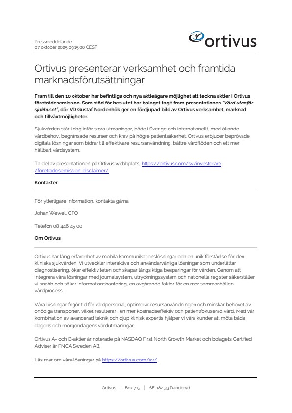 Fram till den 10 oktober har befintliga och nya aktieägare möjlighet att teckna aktier i Ortivus företrädesemission. Som stöd för beslutet har bolaget tagit fram presentationen ”Vård utanför sjukhuset”, där VD Gustaf Nordenhök ger en fördjupad bild av Ortivus verksamhet, marknad och tillväxtmöjligheter.