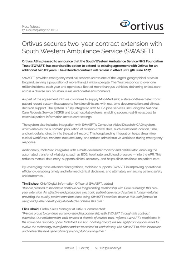 Ortivus has supported SWASFT through a long-standing partnership since 2013, with the current contract, originally signed in 2020, recently extended. This extension marks a continued commitment to advancing the Trust’s digital transformation and further strengthened Ortivus’ commitment to advancing prehospital care across the UK. The value of the two-year extension amounts to 27.7 million SEK.