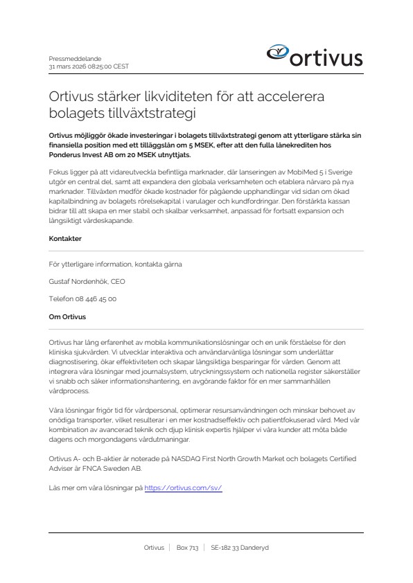 Ortivus möjliggör ökade investeringar i bolagets tillväxtstrategi genom att ytterligare stärka sin finansiella position med ett tilläggslån om 5 MSEK, efter att den fulla lånekrediten hos Ponderus Invest AB om 20 MSEK utnyttjats.
